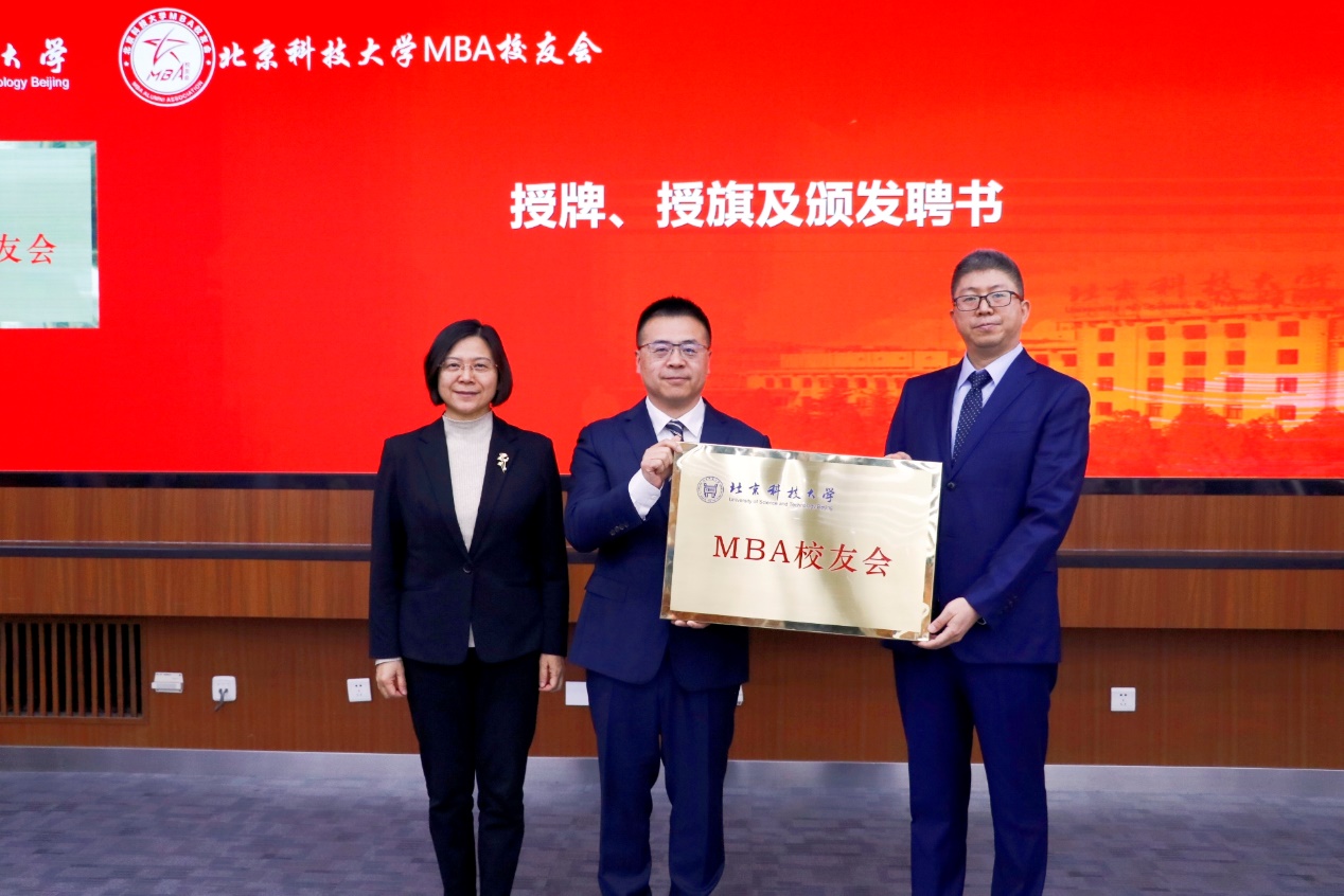 武森为MBA校友会授牌、授旗,并为新一届会长、秘书长颁发聘书;朱文亮、倪宇、王琛分别为新一届副会长、副秘书长及荣誉会员颁发聘书。