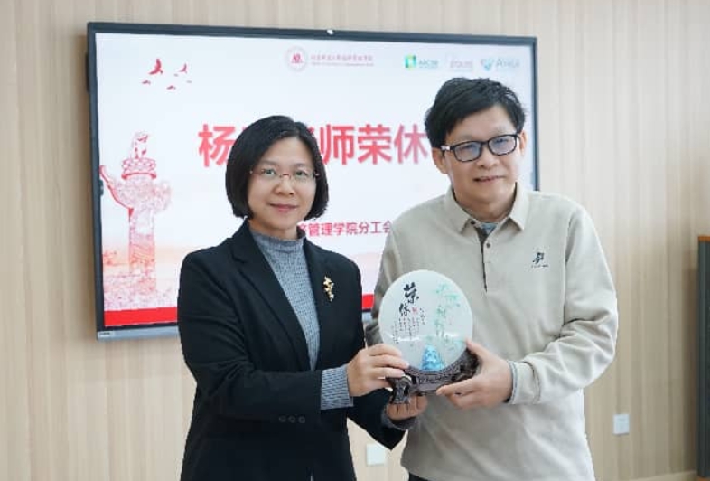随后,杨武老师发表饱含深情的荣休感言。他结合自己跨越多个岗位的职业生涯,分享了与学院共同发展、与同仁并肩奋斗的难忘经历,表达了对教育事业的热爱与对学院深厚情感。言谈之间,无不流露着对同事们的感激与对学院的祝福。